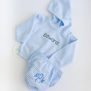This Gift Set includes a baby gown (size 0-3m), baby bloomers (size 0-3m), 1 gingham trimmed burp cloth, and 3" button round.